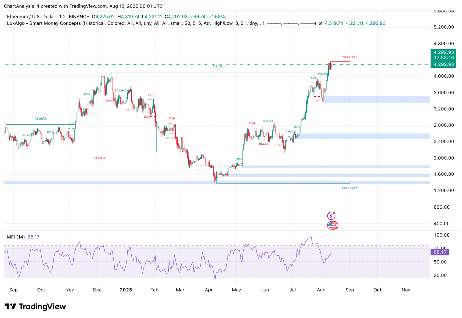The daily Smart Money Concepts view shows that recent BOS and CHoCH activity is pushing the price up to $4,319.74, which is currently a weak high. Buy-side liquidity is still above this level, and the next daily demand is between $3,800 and $3,900. The MFI reading of 68.17 shows that capital inflows are high and moving toward overbought territory, which could slow down the immediate upward trend.