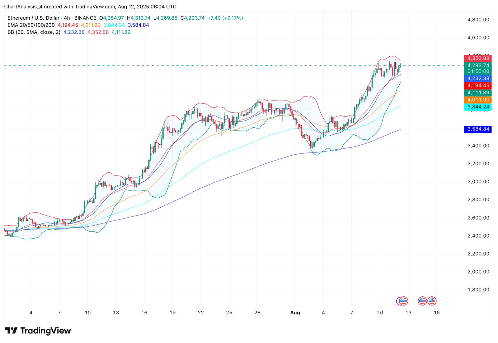 | EMA levels (4H) | EMA20 $4,194.45, EMA50 $4,011.90, EMA100 $3,844.24, EMA200 $3,584.84 |
