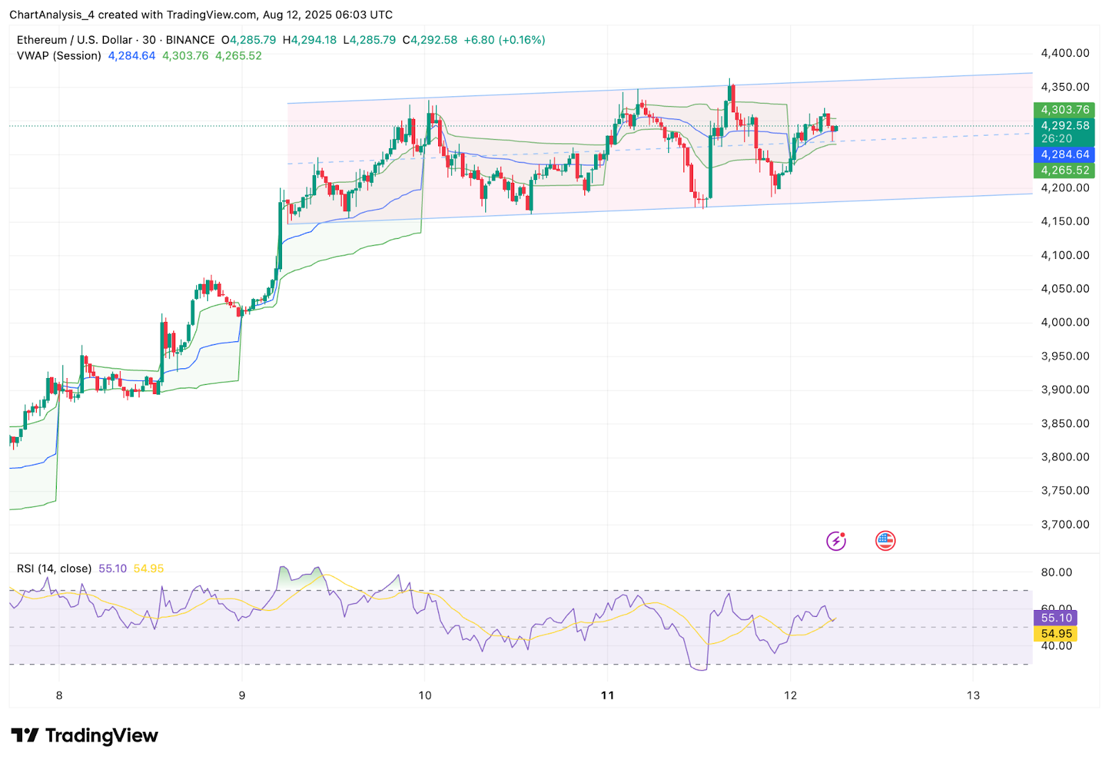 On the 30-min chart, ETH is trading in a mild ascending channel. Session VWAP is $4,284.64, with upper deviation at $4,303.76 and lower deviation at $4,265.52. RSI is at 55.10 with a signal of 54.95, showing balanced momentum with no strong directional skew.