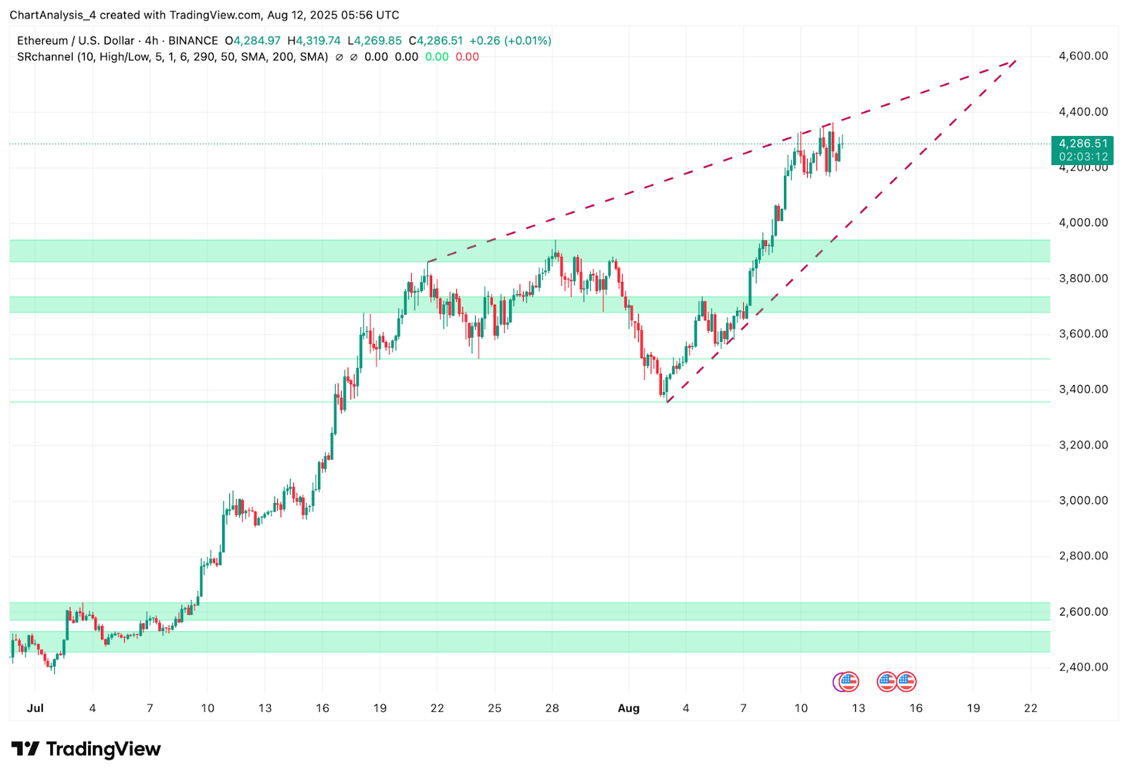 On the 4H chart, ETH is moving inside a rising wedge pattern, with the support trendline starting from the August 7 low near $3,380 and resistance connecting the August 9 and August 12 highs just below $4,350. Immediate supply is visible at $4,350–$4,360, aligning with wedge resistance. Nearest demand is in the $3,980–$4,040 range, with deeper support at $3,780–$3,820. These levels coincide with prior consolidation phases before the latest breakout.