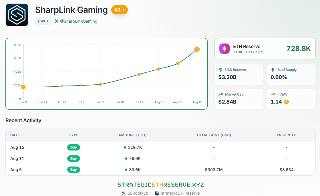Corporate treasuries already expanded to 3.70M ETH, with growth going vertical in August. SharpLink Gaming still has the second-biggest treasury at $728.8K, behind BitMine’s reserves of 1.2M ETH.