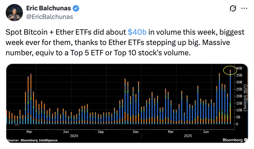 “Ether ETFs’ weekly volume was about $17b, blowing away record, man did it wake up in July,” Balchunas said.