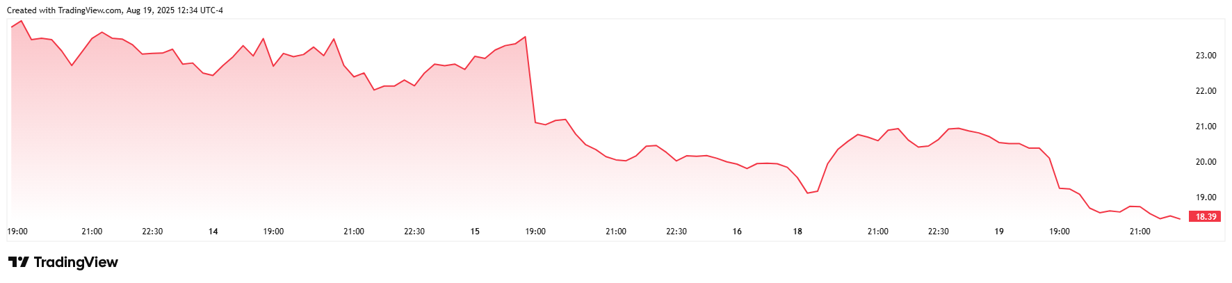 On Tuesday, 19 August, the stock closed at $18.39, extending its decline to 18% over the last five trading sessions, according to TradingView data.