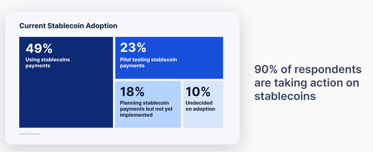Van Eck explained that companies are under pressure to adapt quickly, and a May survey by Fireblocks showed that 90% of institutional players are exploring stablecoin integration. “Companies have to employ technology to enable stablecoin usage over the next 12 months,” he said, and added that no financial institution wants to risk turning away clients who prefer to transact in stablecoins.
