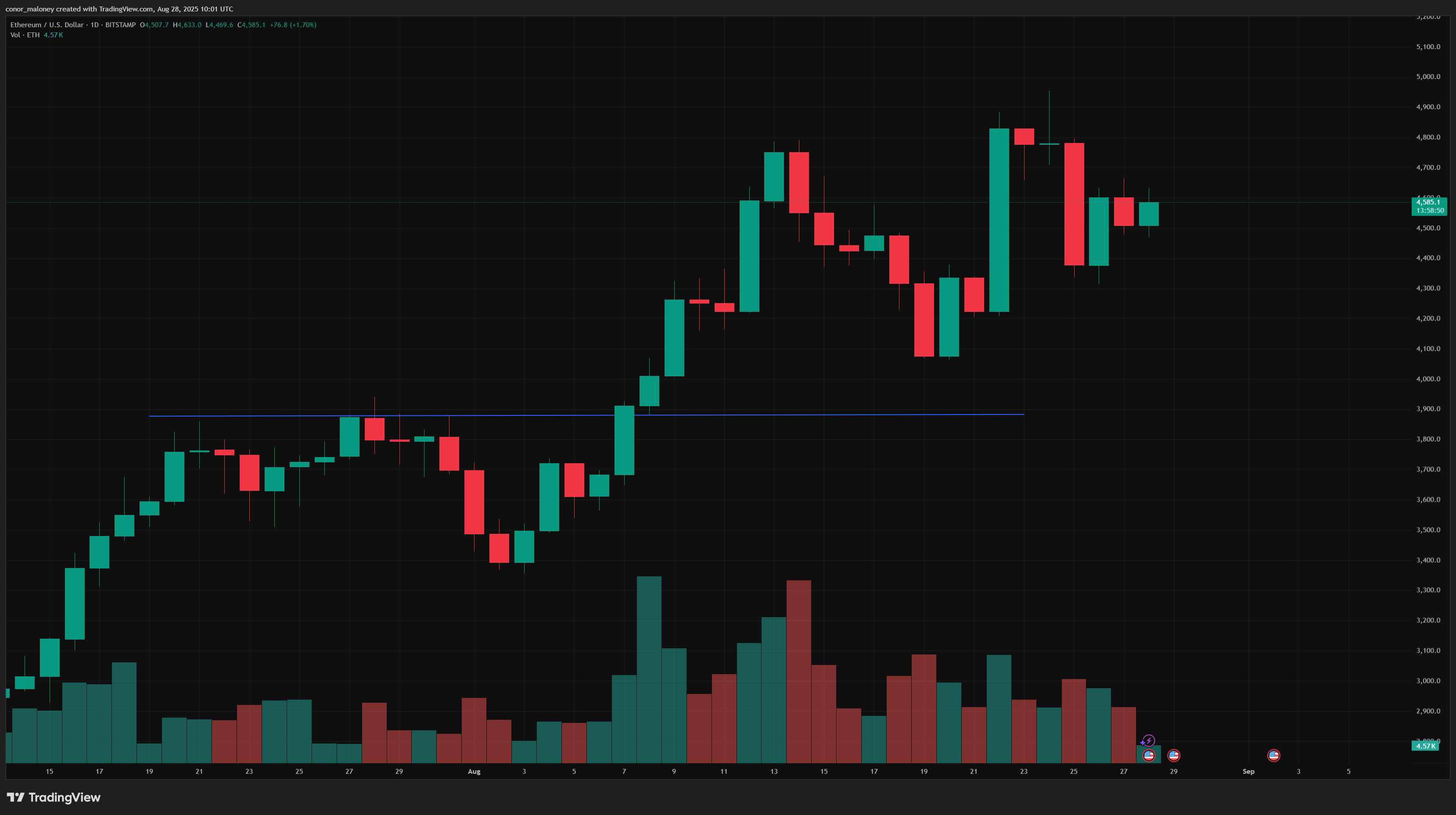 As of August 28, Ethereum is hovering around $4,587, roughly 7% below its fresh all-time high.