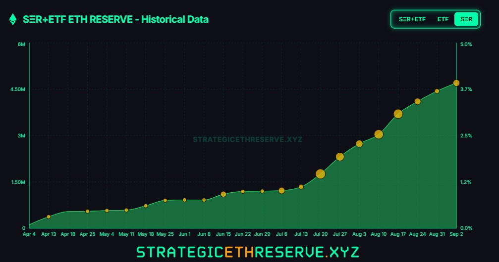 Corporate Ethereum treasuries experienced explosive growth from 916,268 ETH to 4.4 million tokens between June 1 and Sept. 2, according to Strategic ETH Reserve data.