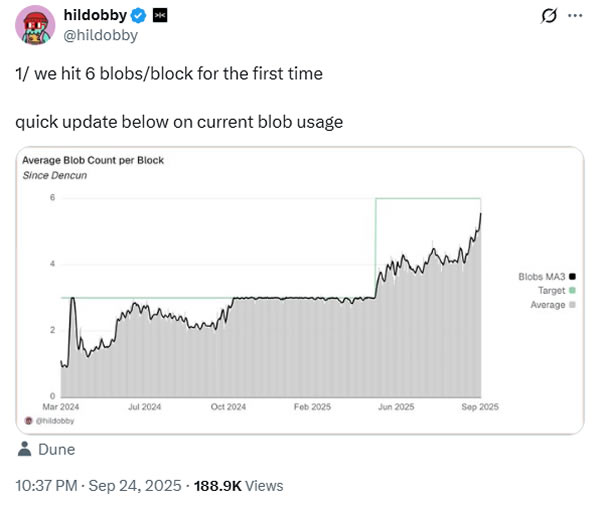 Buterin’s comments came in response to a post from the head of data at Dragonfly, Hildebert Moulié, observing that the network hit six blobs per block target for the first time on Wednesday.