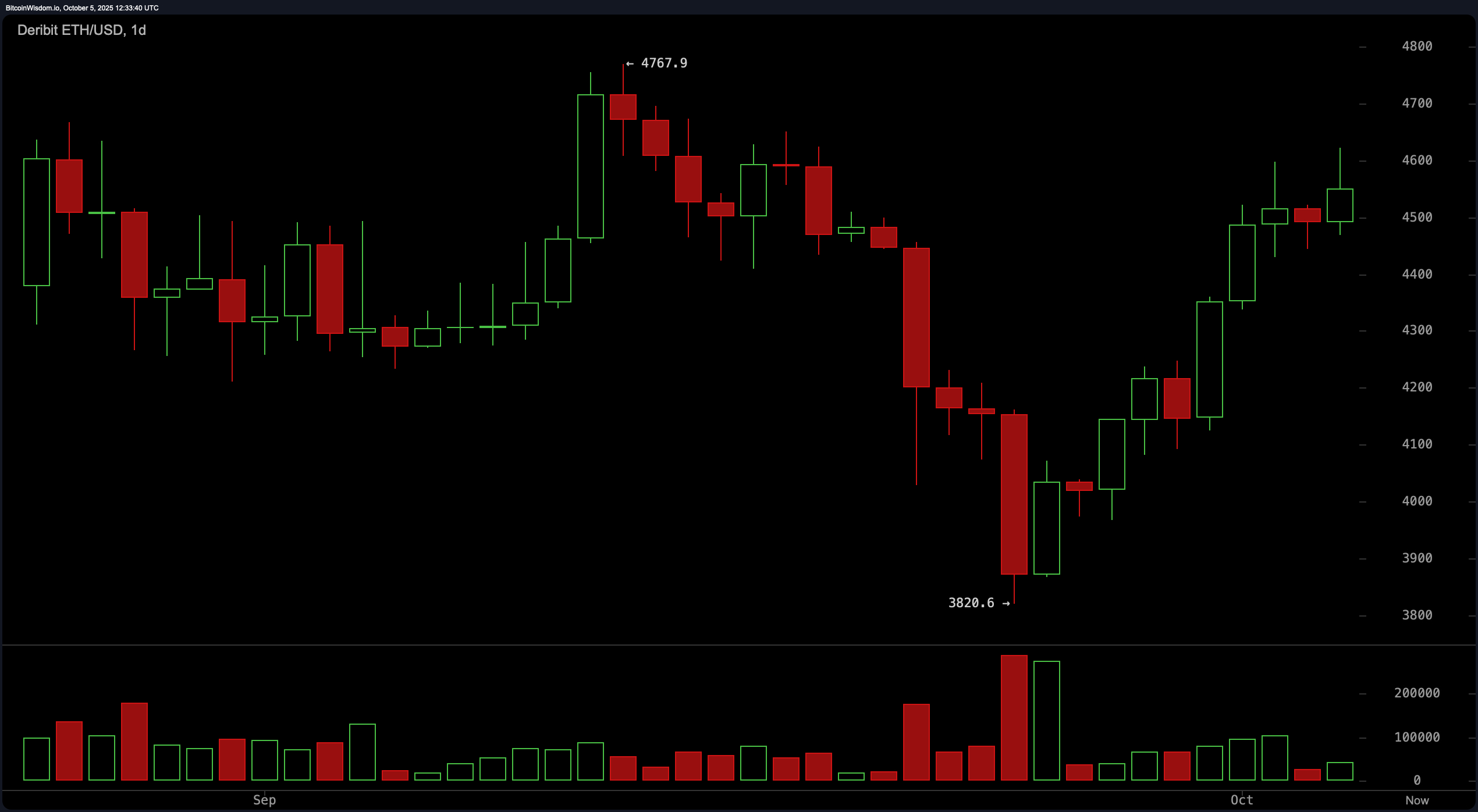 The daily chart is painting a recovery masterpiece. After an early stumble that dragged prices from nearly $4,768 to a sobering low of $3,820, ethereum bounced back like a caffeinated kangaroo. Multiple green daily candlesticks have strutted in, setting higher highs and higher lows, while increased volume on the up days implies this isn’t just hopium—it’s bullish conviction.