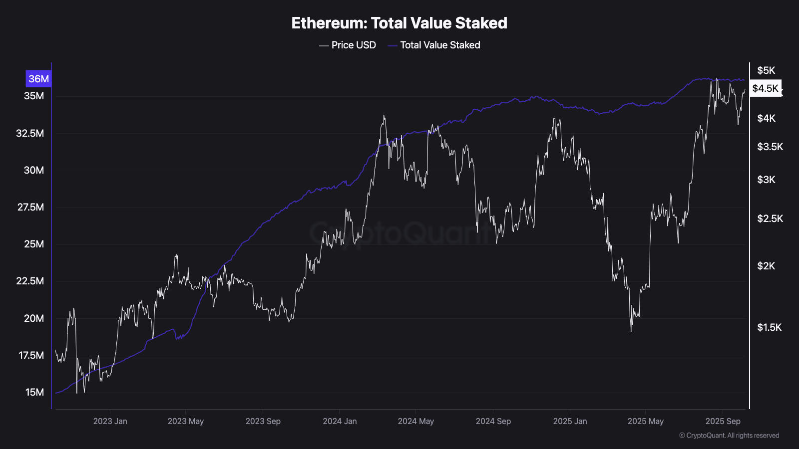 Nearly 36 million ETH—about 30% of the total supply—is now locked in staking contracts, reducing liquid circulation and supporting price stability.