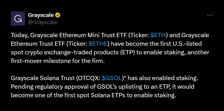 - Grayscale has launched the first U.S-listed Ethereum and Solana spot crypto ETPs that provide staking rewards.