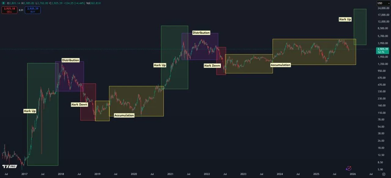Crypto GEMs argues that Ethereum has entered a fresh accumulation zone under the Wyckoff market-cycle framework, based on a long-term price chart that labels prior mark-up, distribution, mark-down, and accumulation phases. The current range follows the 2022–2023 decline, which the analyst treats as the last mark-down before a potential trend reset.
