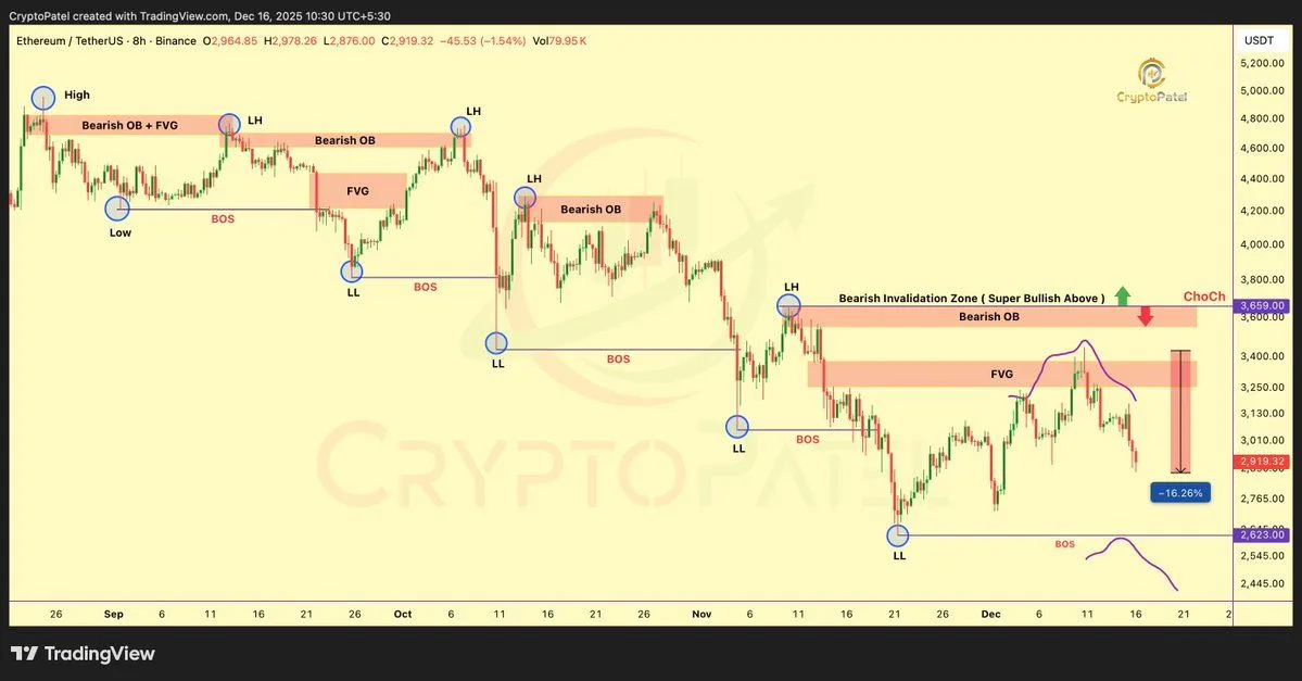 CryptoPatel said Ethereum rejected a marked fair value gap near $3,400 and then slid to around the $2,900 area, based on his Dec. 16 TradingView chart and an accompanying post on X. He described the move as a roughly 16% drop from the rejection zone and said the broader structure still looks bearish.