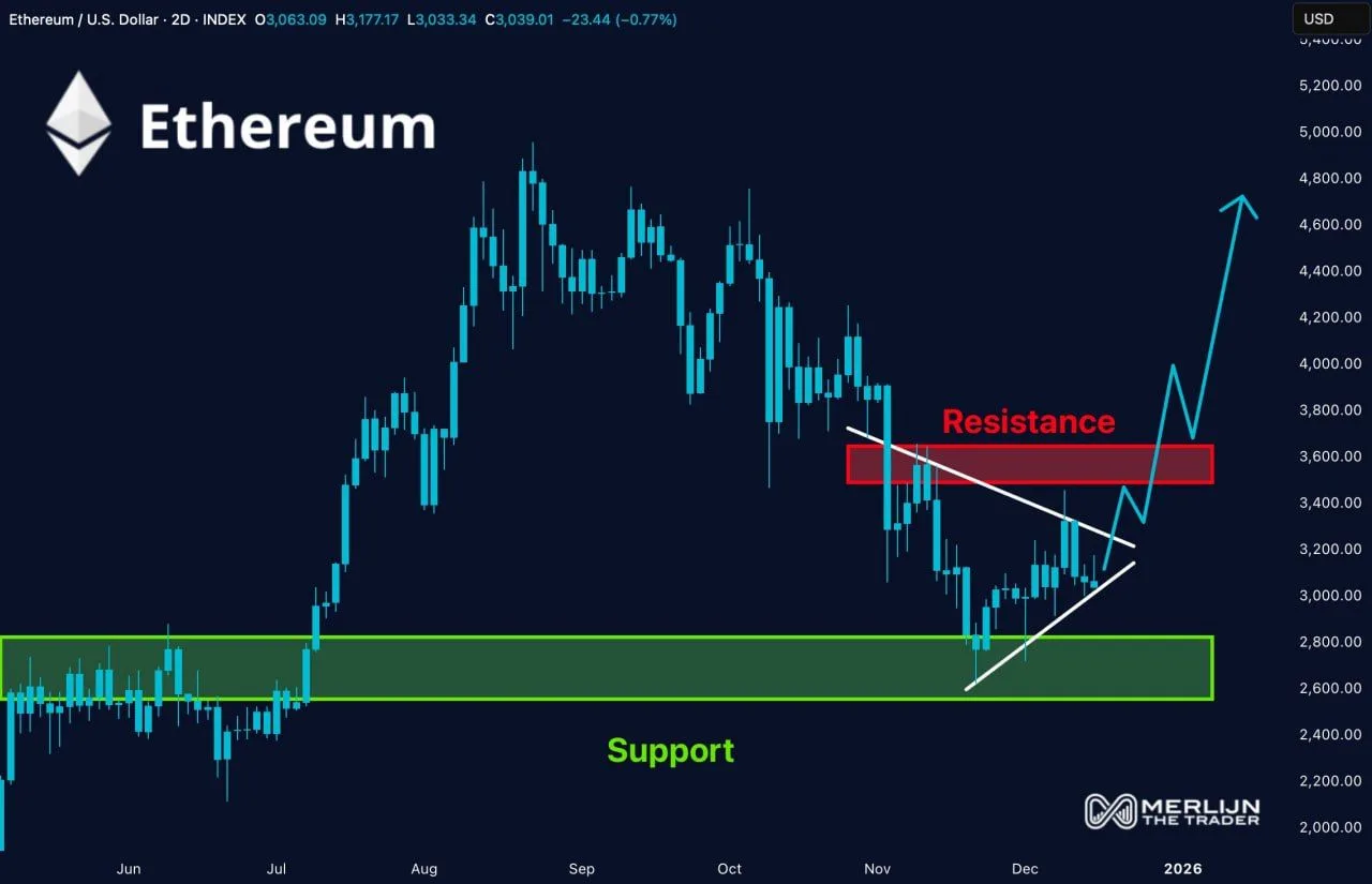 Meanwhile, Merlijn The Trader said Ethereum is “coiling” after holding a broad support zone and pressing into a weakening resistance band near $3,600, according to a post on X that included a two day ETH USD chart. He also said volume is starting to rise.