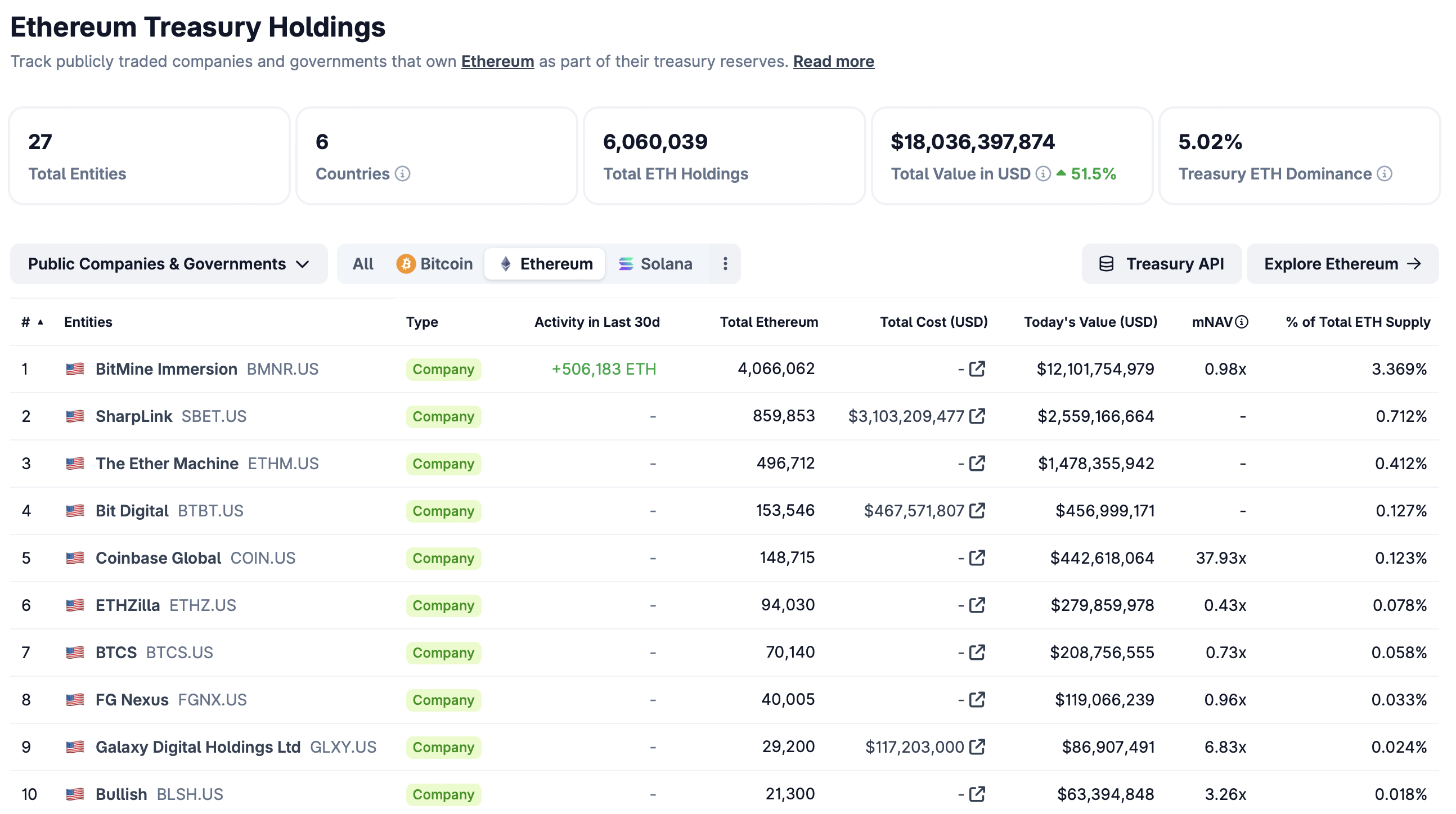 Ether has gauged similar demand from investors. According to CoinGecko data, 27 public companies collectively hold about 6 million ETH, also representing about 5% of the token's circulating supply.