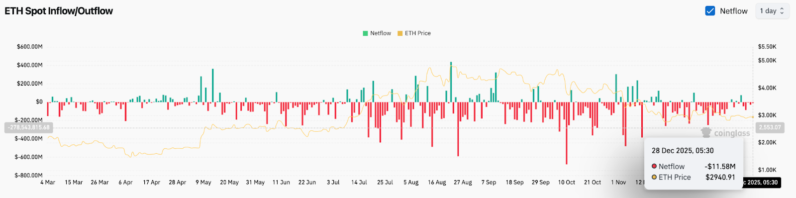 Exchange flow data continues to lean defensive. Recent sessions show persistent net outflows, including a $11.6 million net outflow on December 28. While the magnitude is smaller than earlier distribution waves, the direction matters. Capital is not aggressively rotating back into spot positions.