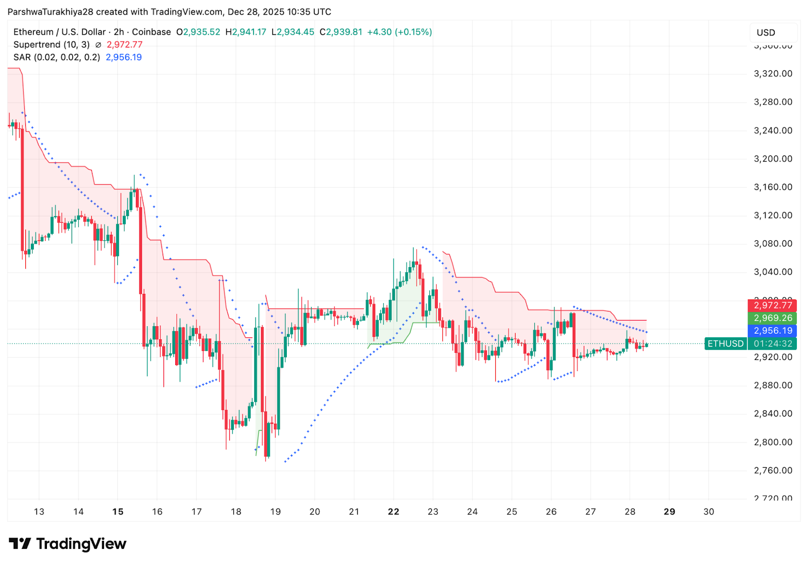 On the 2-hour chart, ETH remains capped by Supertrend resistance near $2,970. Parabolic SAR dots stay above price, confirming that short-term control remains with sellers. Each bounce has stalled below $3,000, reinforcing that level as a psychological ceiling.