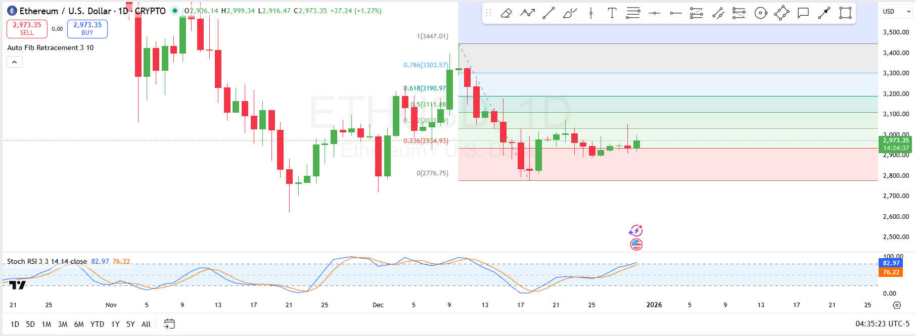 From a technical standpoint, Ethereum is testing the 0.236 Fibonacci retracement level at $2,934.93, with the next resistance zone lying near the 0.382 Fibonacci level at $3,032. A breakthrough above this level could open the door for Ethereum to target the 0.5 level at $3,111, signaling a potential continuation of the recent uptrend.