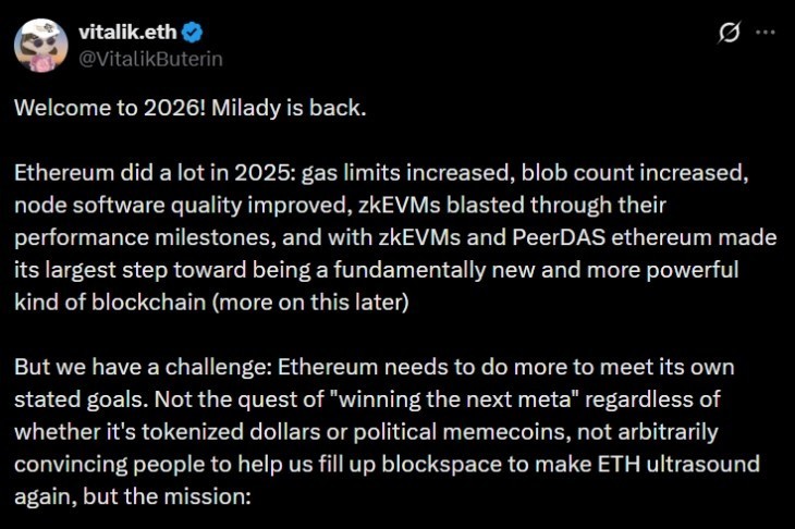 Vitalik Buterin issued a major warning to start 2026, which urges the community to refocus on Ethereum’s original plan as a censorship-resistant “world computer.” He argued that without built-in privacy-preserving features, users might flee to a centralized alternative that better protects financial data.