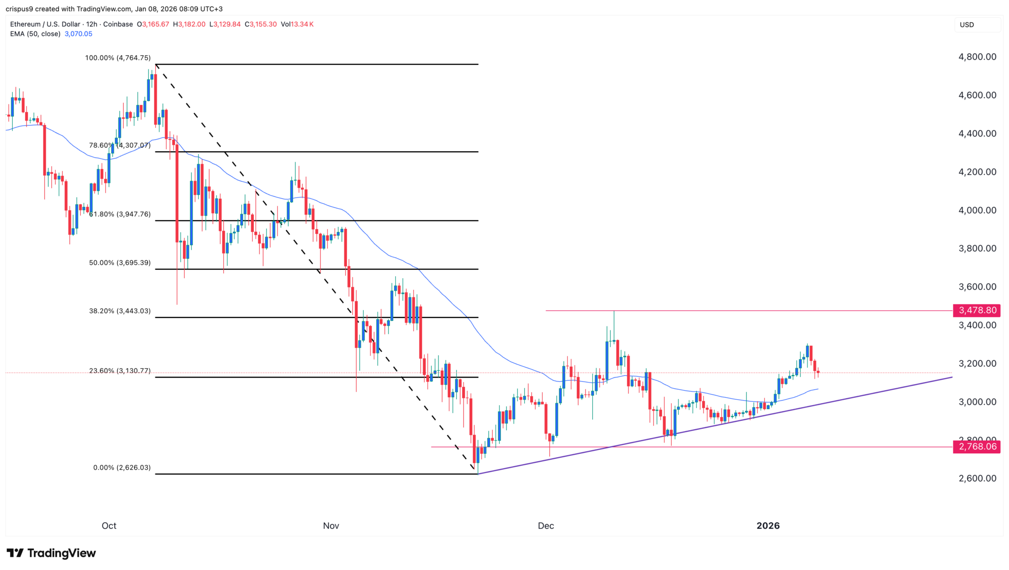The twelve-hour chart shows that the ETH price has done well in the past few months, moving from a low of $2,768 in December to the current $3,155.