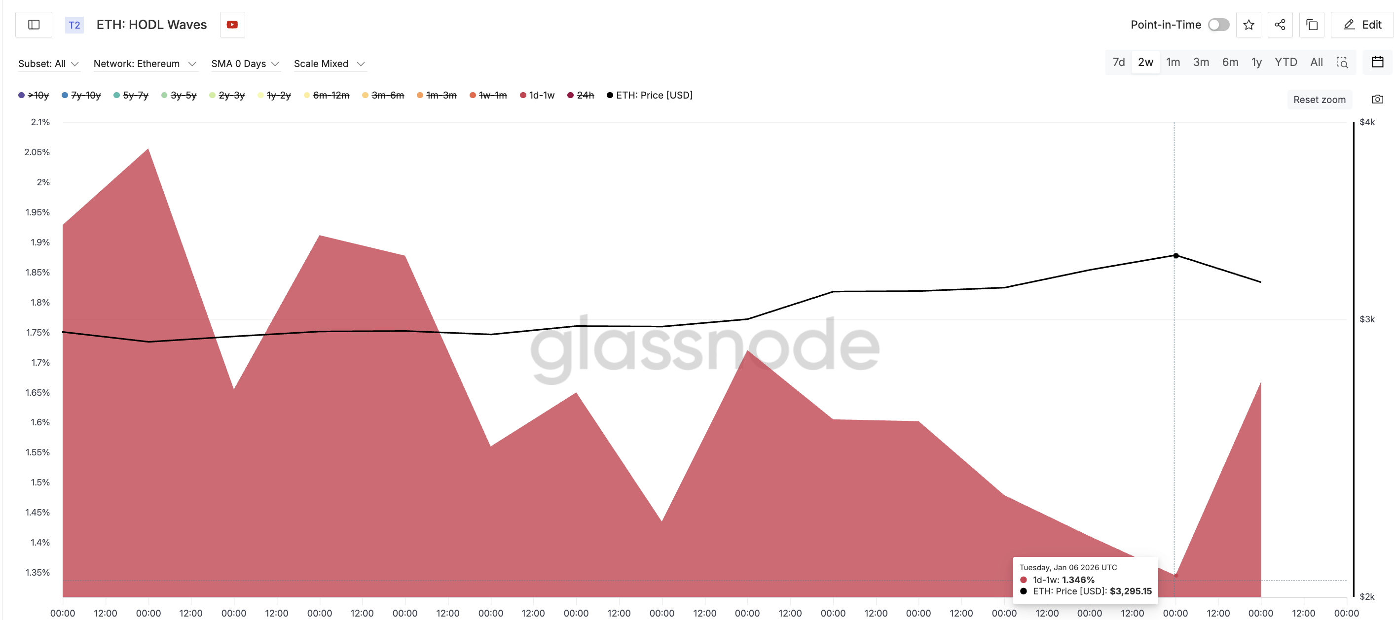 Wallets holding ETH for one day to one week reduced their share of supply from about 2.05% in late December to roughly 1.34% as the price tested resistance on January 6. That selling lined up closely with the rejection near the upper trendline.