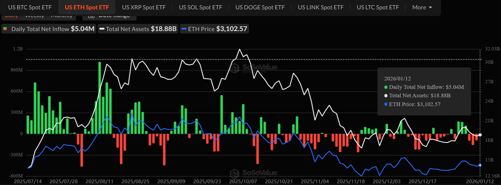 Data on SoSoValue shows that on January 12, spot Ethereum ETFs reported a total net inflow of $5.042 million. With this, they effectively ended a 3-day net outflow streak.
