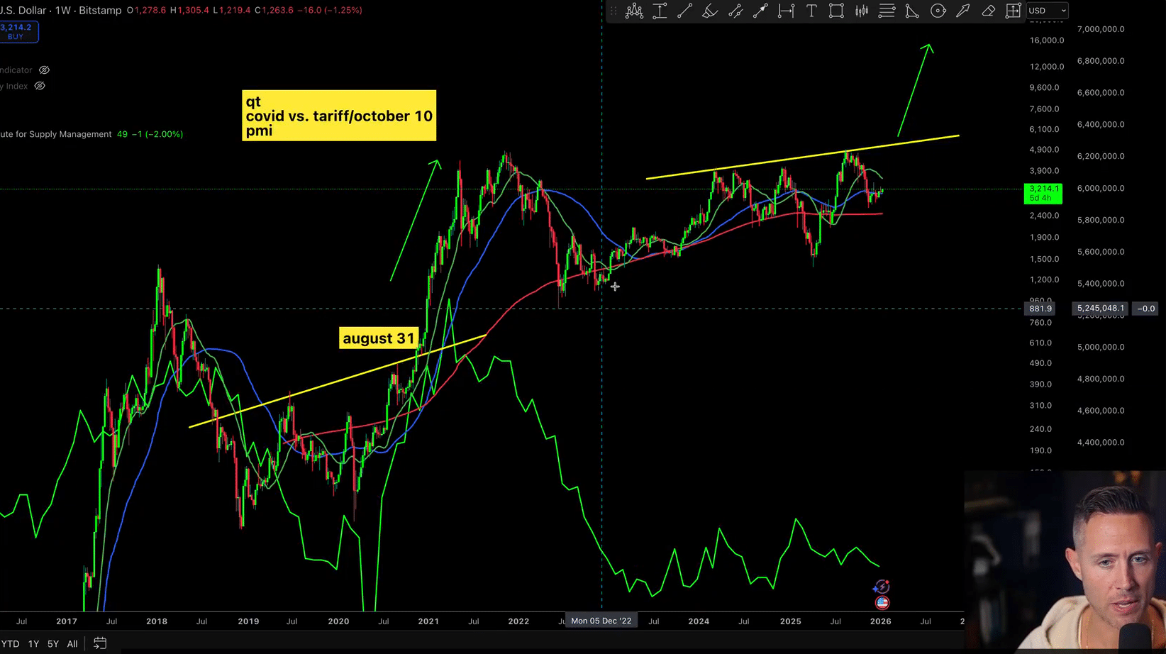 The left shoulder formed from September 2024’s dip to $2,150, the head from April 2025’s low of $1,385, and the right shoulder is still in work after a dip to $2,620 in November 2025. Meanwhile, the breakout neckline lies around the $5,300 price level.