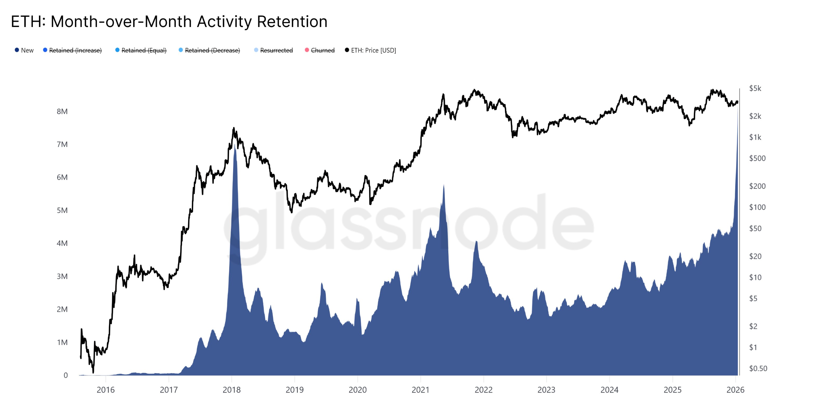 Data on Ethereum’s month-over-month activity retention shows a pronounced spike in the “new” cohort — a metric that tracks wallets making their first recorded interaction on the blockchain within a given period.