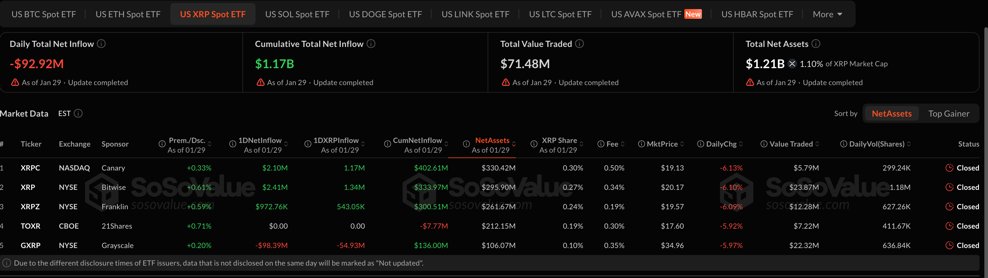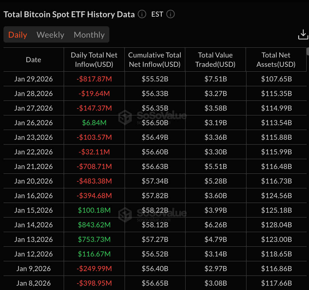 According to SoSoValue data, investors withdrew $817.9 million from U.S. spot bitcoin ETFs on Jan. 29, the largest daily outflow since Nov. 20. Ether ETFs also saw sustained selling, losing $155.6 million on the day.