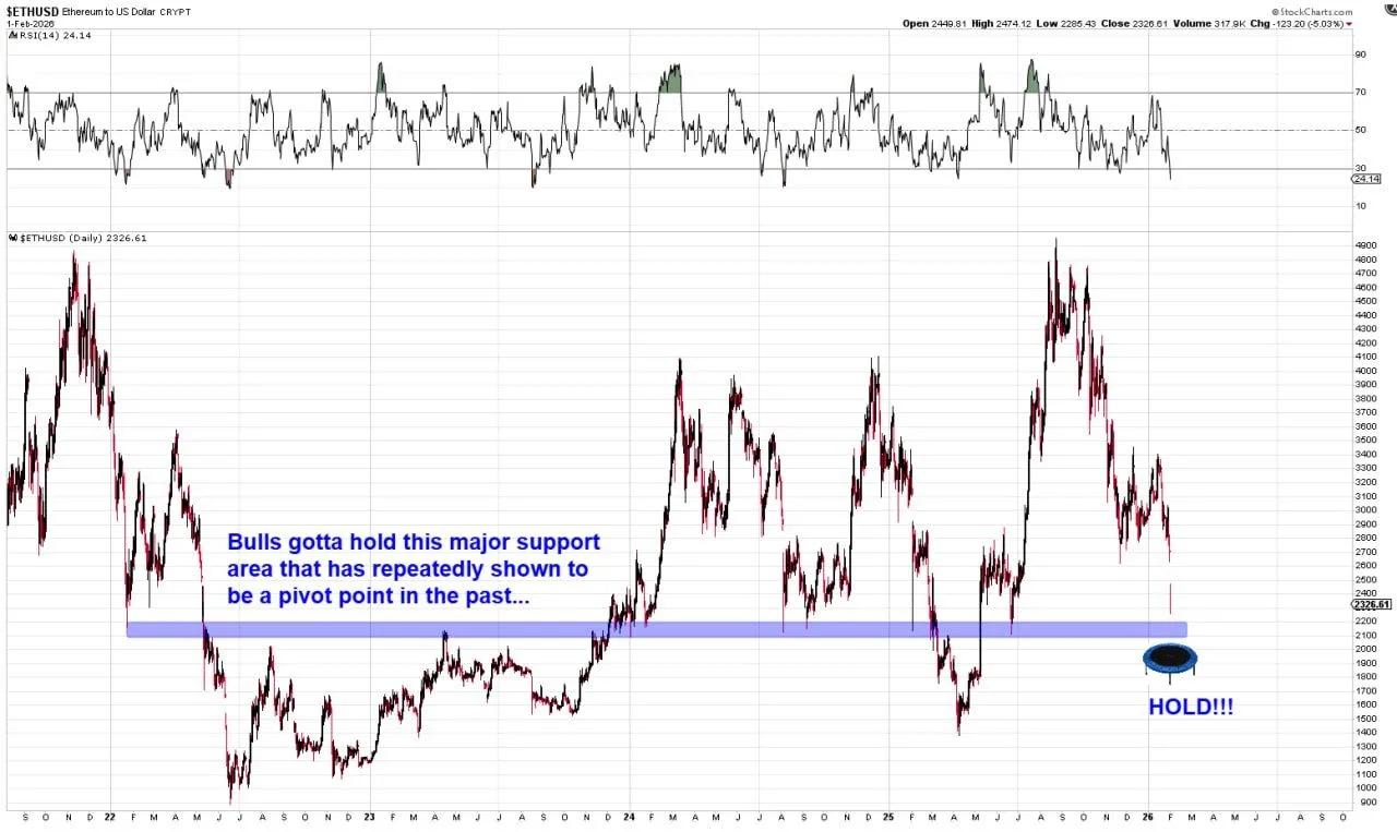Ethereum is pressing into a major technical support band between $2,100 and $2,200 after an extended decline from late-2025 highs. The daily chart shows price returning to an area that has repeatedly acted as a pivot point during prior cycles, with sharp reactions in both directions. As ETH trades near $2,326, pressure continues to build around that zone.