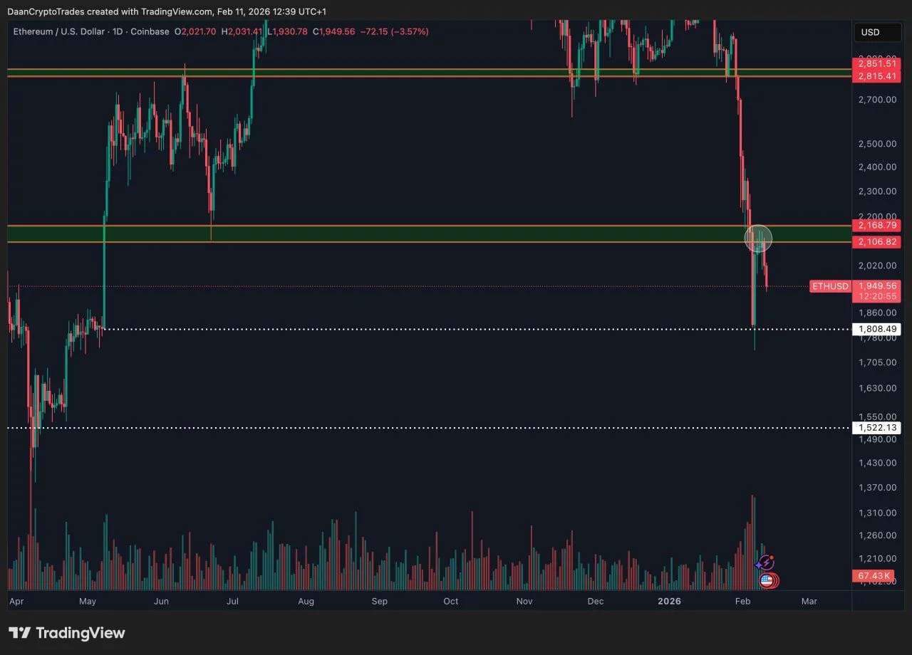 Ethereum traded at about $1,949 on the daily $ETH/USD chart from Coinbase shared by X user Daan Crypto Trades, with the snapshot timestamped Feb. 11, 2026. The chart showed a sharp selloff from the $2,800 area into the low $2,000s, and then a fast rebound that failed near a highlighted resistance band around $2,106 to $2,169. As a result, price turned lower again after briefly pushing into that zone.
