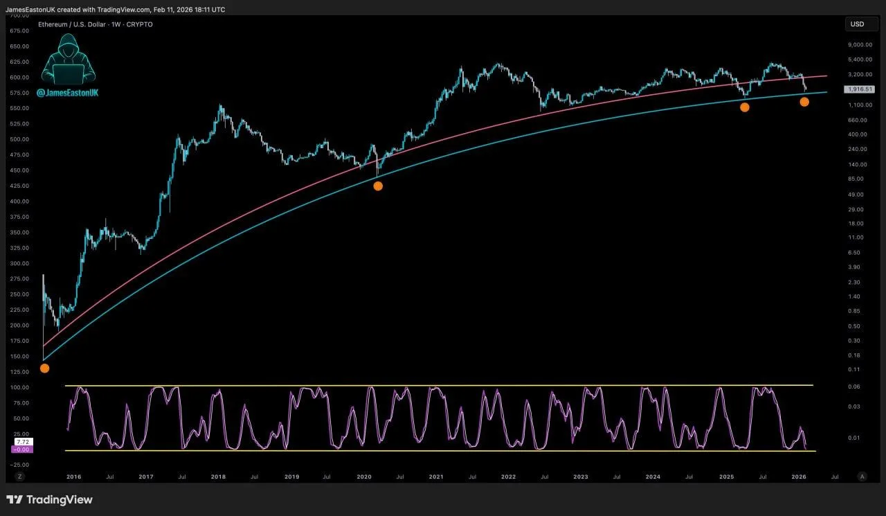 Ethereum traded near $1,916 on the weekly $ETH/USD chart from TradingView dated Feb. 11, 2026, as price slipped toward a rising long-term trendline tracked by X user James Easton. The chart spans from 2016 through early 2026 and plots two upward-sloping moving averages that have guided the broader cycle. Recent candles sit below the upper curve and closer to the lower band, which signals a shift from sustained upside momentum into trend support testing.