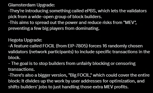 Ethereum plans on implementing Proposer-Builder Separation (ePBS) and Fork-Choice-Enforced Inclusion Lists (FOCIL) within this year’s Glamsterdam and Hegota upgrades. Both aim to uphold network decentralization and scalability while increasing speed, privacy, and security.
