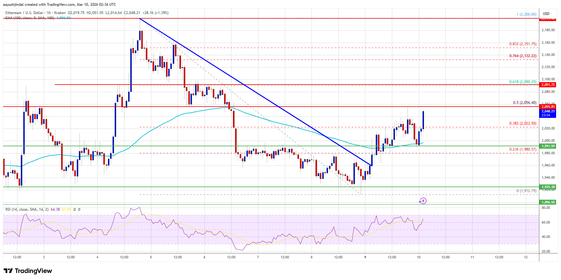 The bulls even pushed the price above $2,020. Ethereum price is now trading above $2,000 and the 100-hourly Simple Moving Average. If the bulls remain in action above $2,000, the price could attempt another increase. Immediate resistance is seen near the $2,050 level.