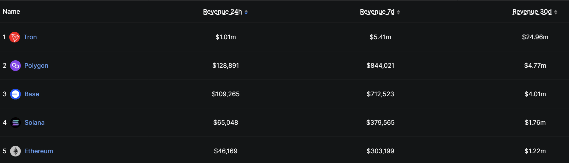 On a revenue basis, the gap widens further. Ethereum ranked fifth in 30-day protocol revenue at $1.22 million, trailing Tron as well as Polygon, Base and Solana. Base, an Ethereum layer-2 network built by Coinbase, generated roughly three times Ethereum’s protocol revenue over the same period.