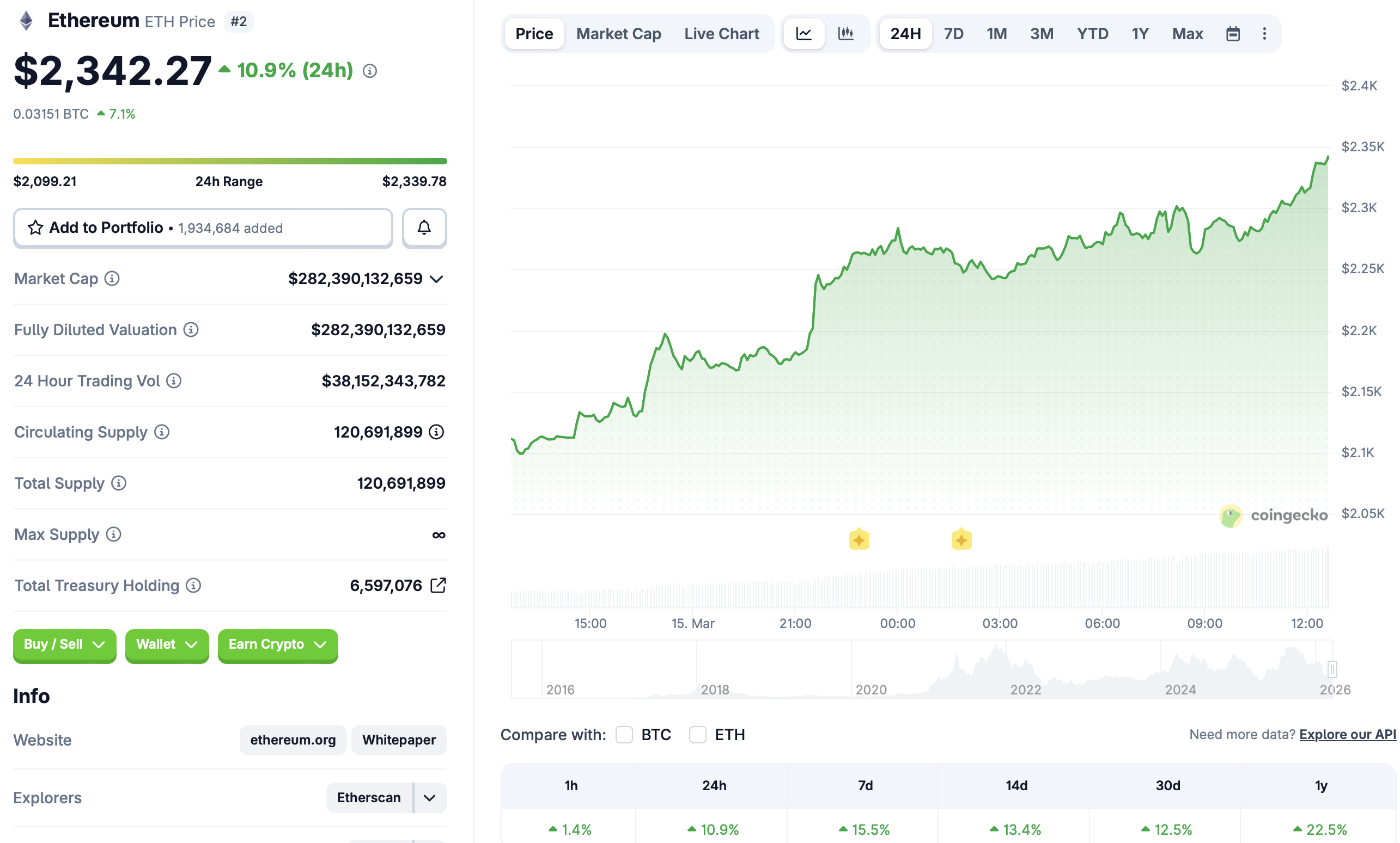At the time of writing, Ether was trading at around $2,342, up nearly 11% over the past 24 hours, a year-to-date decline at around 21%. The cryptocurrency currently has a market capitalization of about $282 billion, with around 120.7 million $ETH in circulation.