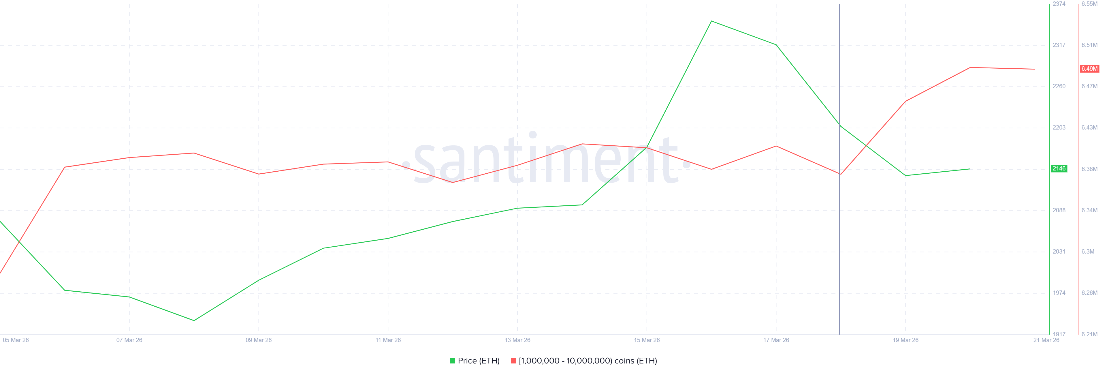 The divergence is clearest between mid-March and March 19. As the Ethereum price dropped from $2,317 to below $2,150, whale holdings increased. Accumulation during a sell-off points to strong conviction.