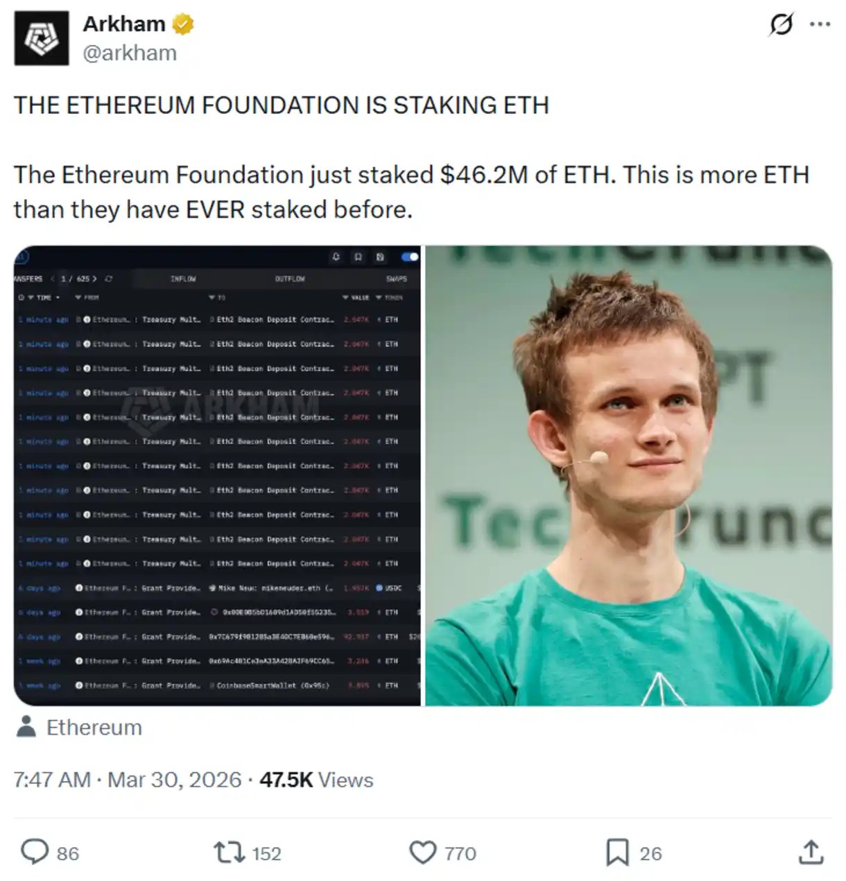 According to Arkham-tracked wallet activity, shared in an X post on March 30, the Ethereum Foundation sent the 22,517 $ETH to the Eth2 Beacon Deposit Contract, pushing a fresh batch of treasury assets into staking.