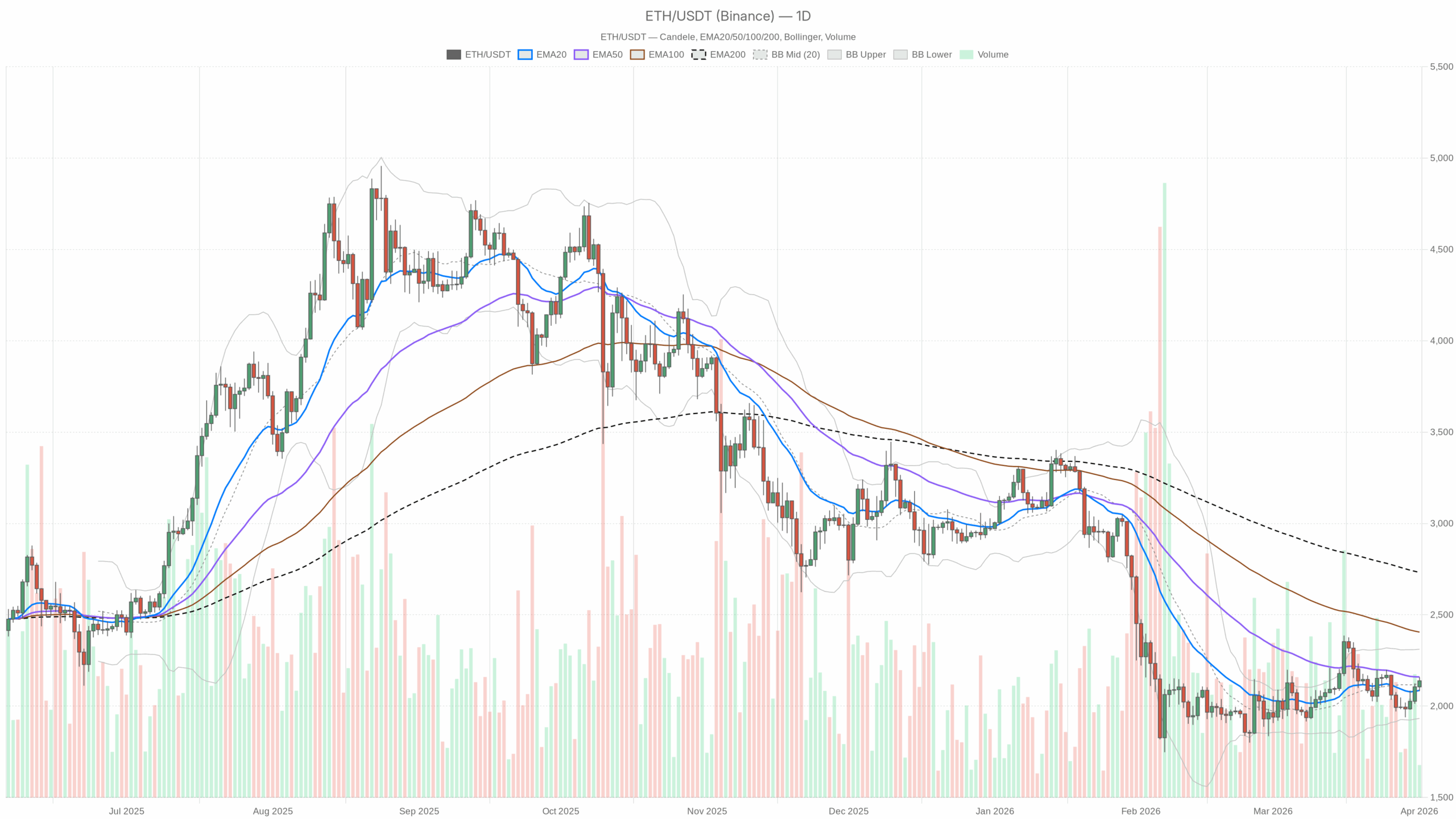 For anyone watching Ethereum closely, the next meaningful information will come from how price behaves around the $2,095–2,170 band. Acceptance above that band pulls $ETH toward the upper daily Bollinger and challenges the bearish narrative. Rejection there and a slide back below the 20-day EMA would confirm that this was just another rally inside a larger downtrend. Until that resolves, the bias remains neutral on the daily with a short-term bullish skew.