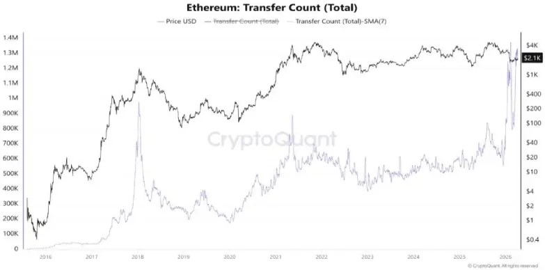 Ether transfer volume has shot up once more, with its seven-day simple moving average exceeding 1.3 million by the beginning of 2026. As per CryptoQuant data, this amount is equal to the last high in mid-February, so the metric is at one of its most robust points since its inception in 2016.