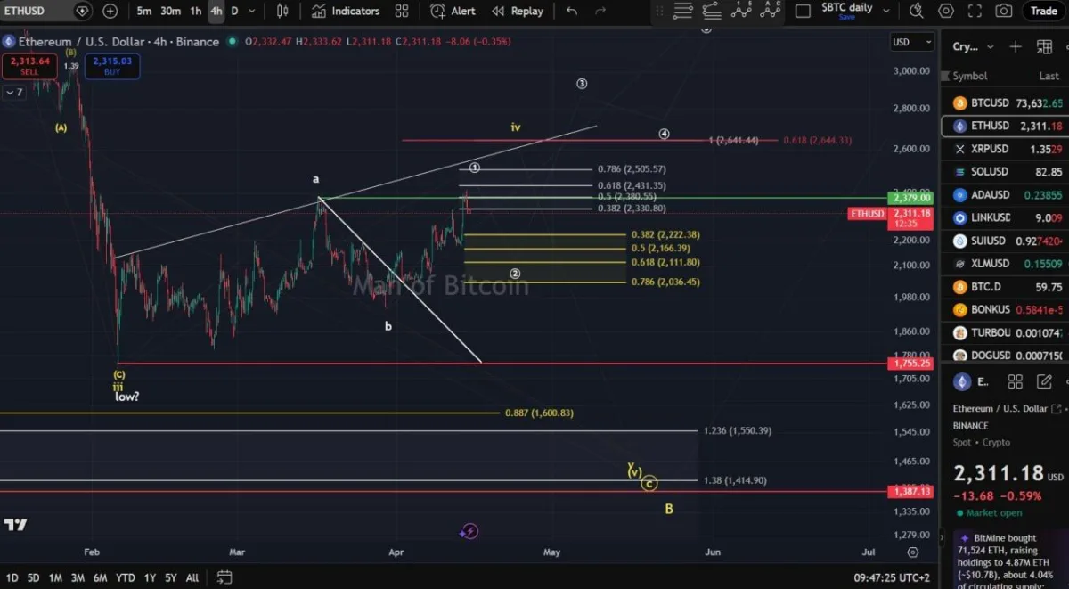The 4 hour chart shows Ethereum trading near $2,311 after pulling back from the recent local high around the $2,380 area. The analyst marked the current move as a possible corrective decline, with Fibonacci support levels stacked below price. Those levels include $2,222, $2,166, $2,111, and $2,036, which together form the main support zone for the expected wave two retracement.