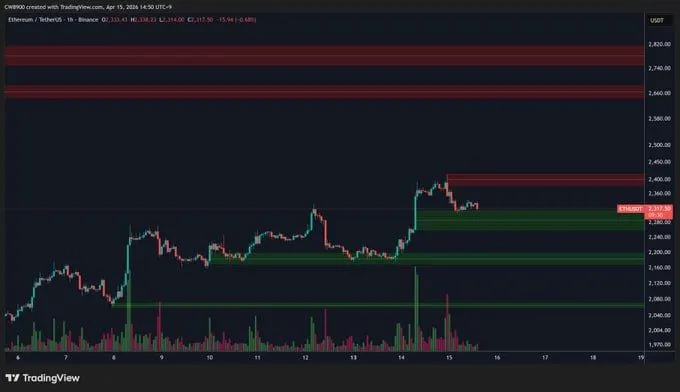 The 1 hour $ETH/$USDT Binance chart showed Ethereum trading near $2,317.50 as price drifted lower into a green support area. CW said that zone represents the buy wall, where buyers may step in and try to slow the pullback. The chart also showed that $ETH recently failed to hold above the nearby resistance band after a sharp move higher.