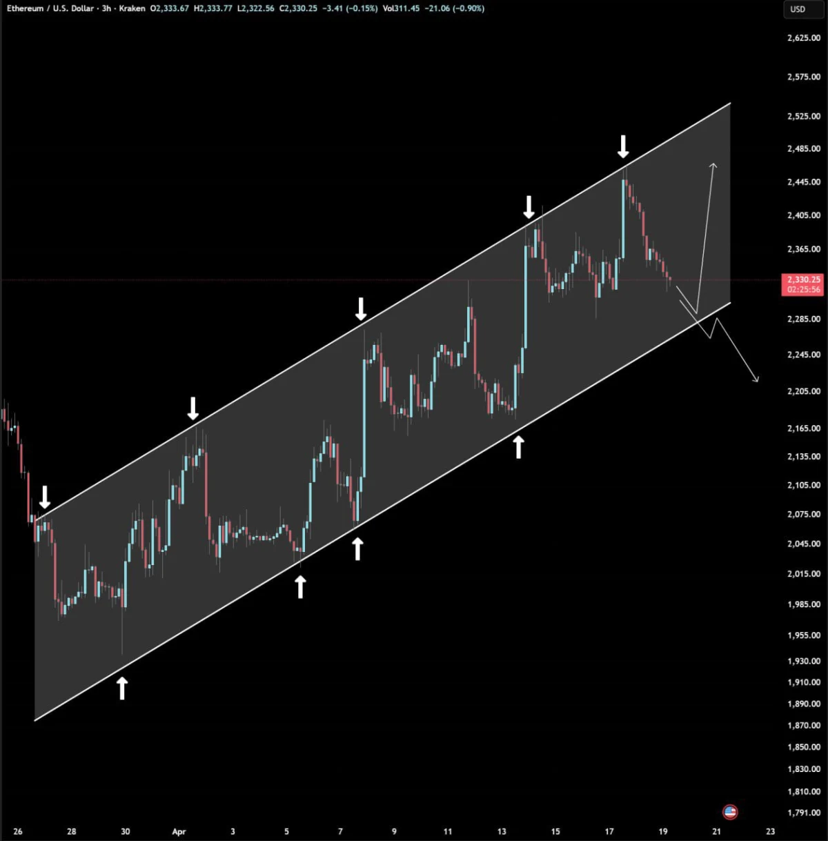 However, the chart also outlines a bearish alternative. If Ethereum breaks below the lower channel support, the move could open the way for a deeper drop toward lower support levels. In that case, the channel would stop acting as a guide for the uptrend and instead become a failed structure.