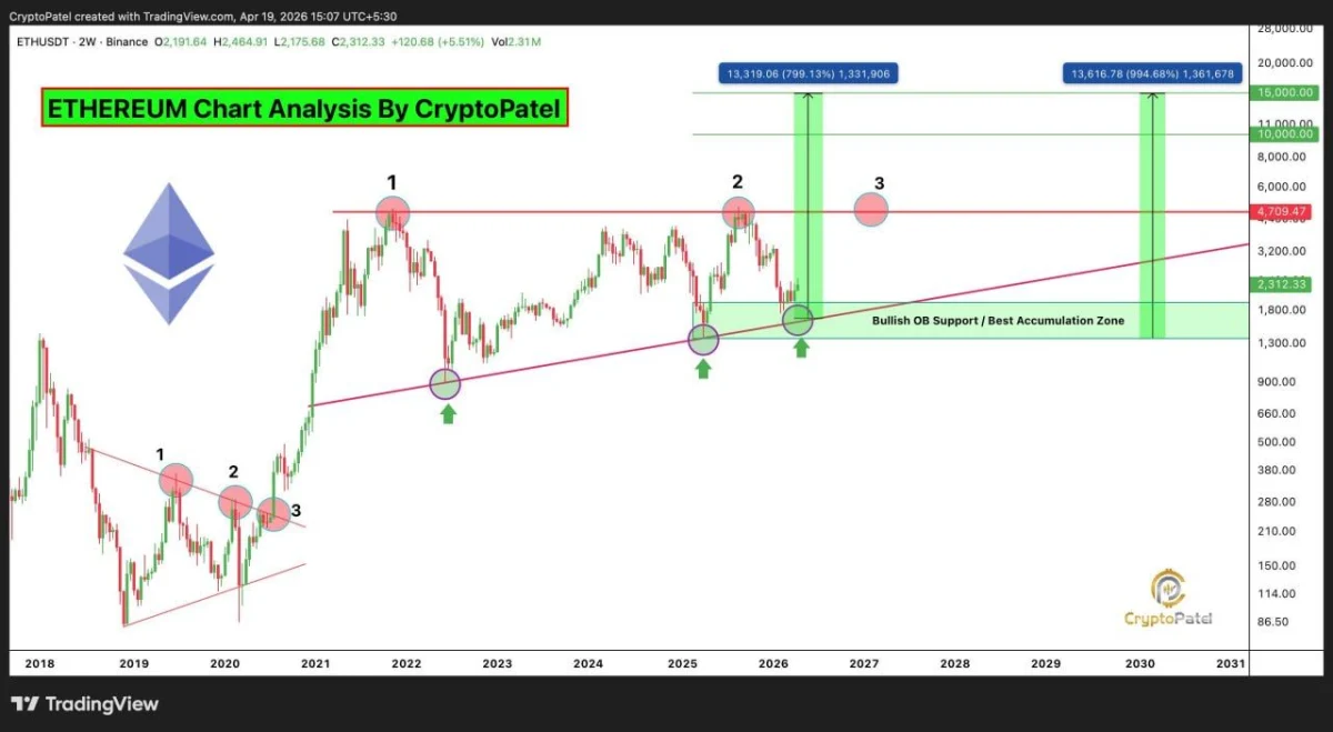 Ethereum could remain in a broader long term uptrend if it continues holding a key support zone between roughly $1,300 and $1,800, according to a 2 week chart shared by X user Crypto Patel. The setup outlines a multi year structure with rising support, repeated tests of major resistance near the $4,700 area, and a projection window stretching into 2028 and 2029. That makes the chart less about immediate price action and more about how Ethereum may behave over the next few years.