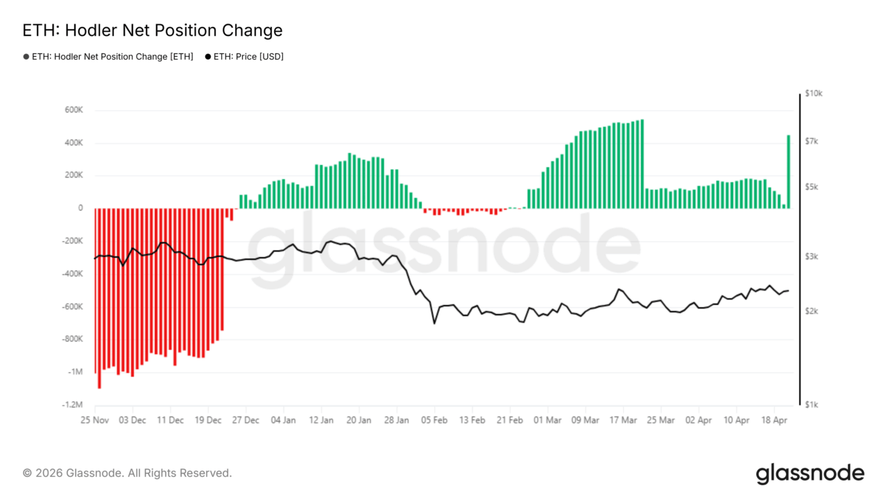 The Hodler Net Position Change metric saw a surge to indicate increased buying from long-term investors. The metric has been green since late February, showing long-term holder confidence in the leading altcoin.