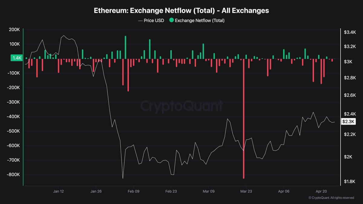 What is particularly striking is the acceleration in net outflows through April. Despite $ETH failing to break above $2.4k, holders are continuing to withdraw $ETH from exchanges at an elevated pace. This behavior points to conviction accumulation rather than opportunistic profit-taking.