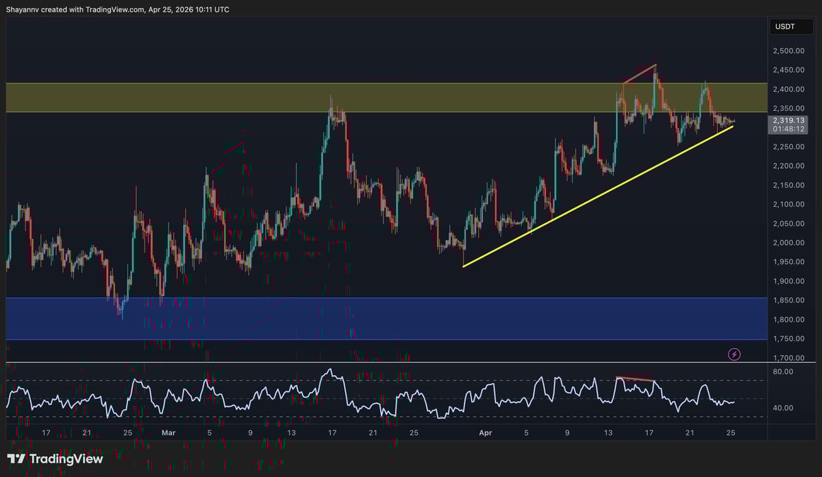The 4-hour chart shows a sharper ascending trendline that has been guiding price since the late-March lows, now providing support near $2.3k. $ETH is sitting directly on that trendline at the moment, having pulled back from the recent rejections at $2.4k. These rejections were accompanied by a bearish RSI divergence visible on the chart, where the price made a marginally higher high while RSI printed lower.