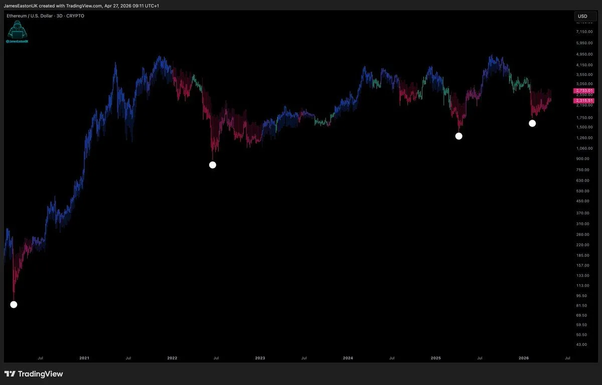 The chart shared by James Easton marks several key lows with white dots. Each low came after a broad decline, followed by a recovery period and then a stronger upside move. The latest white dot appears near the 2026 low, suggesting $ETH may be trying to build another base.