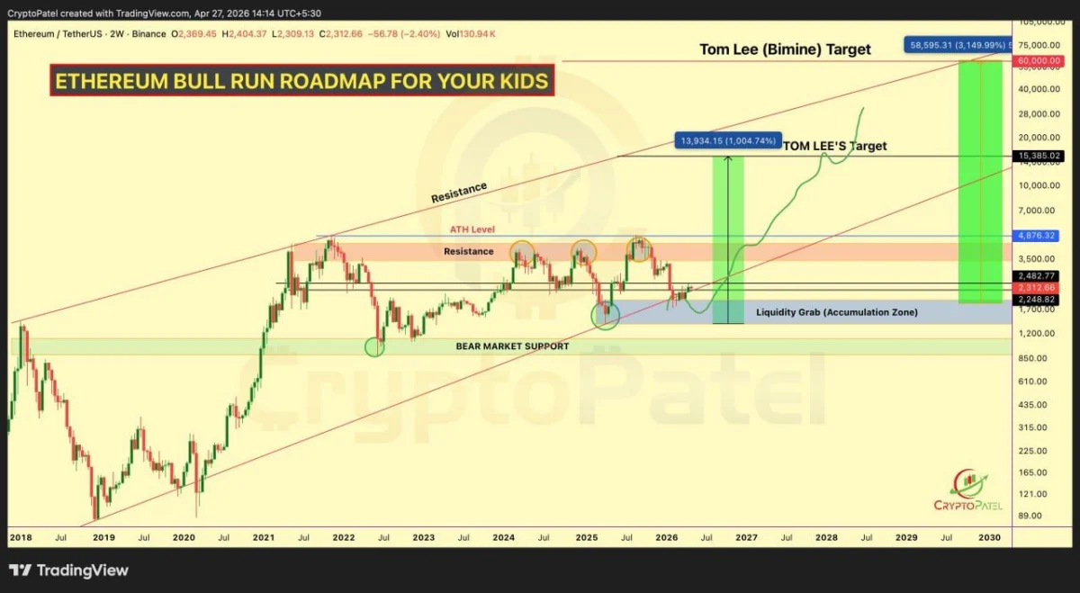 Ethereum is trading near the lower part of a long term upward structure, while a chart shared by Crypto Patel points to a possible move toward much higher targets over the coming years.