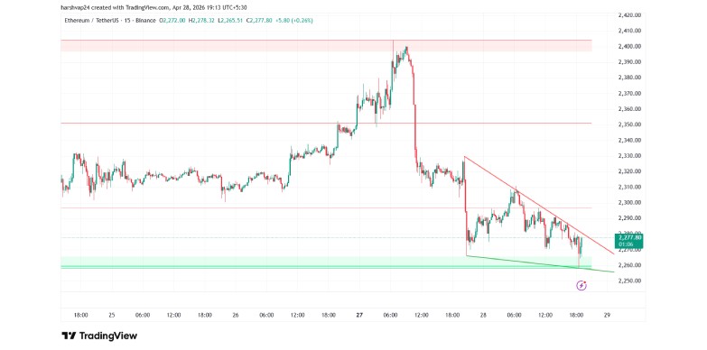 As the market digests BitMine’s massive absorption of liquidity, the technical setup for Ethereum suggests a period of intense coiling before a potential macro breakout. On the 15-minute chart, the $ETH is currently trading near $2,276.85, caught within a descending triangle formation that has tested the $2,260 support floor multiple times. This level has acted as a “line in the sand” for bulls, with BitMine’s ongoing accumulation effectively acting as a massive buy-wall that prevents a breakdown into the $2,100 demand zone.