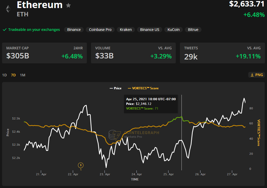 As seen in the chart above, the VORTECS™ Score for Ether began to trend higher on April 23 and registered a high score of 71 on April 25, roughly five hours before the price began to rally 11% over the next two days.